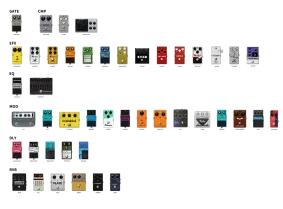 • وحدات تأثيرات غايت (بوابة الضوضاء)، سي ام بي (الضاغط)، اي اف اكس (تأثيرات خاصة)، اي ام بي (المضخم)، اي ار (استجابة الدافع)، اي كيو (المعادل)، مود (التعديل)، ديلاي (التأخير)، ار في ي (الصدى) بترتيب حر
