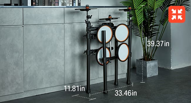 تأتي مجموعة الطبول الكهربائيّة مع حامل حديدي قابل للطّيّ مع إطار من الألومنيوم مكوّن من ٤ أعمدة فيوفّر الثّبات والأمان، بالإضافة إلى التّحكّم في الهاي هات، ودوّاسة طبل الجهير، وسمّاعات الرّأس، ومقعد الطّبل، وكابل الصّوت، وأعواد الطبل، فهناك كلّ ما تحتاجه.