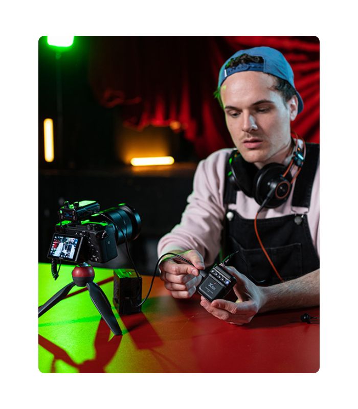 • خيارات أحادية وستيريو: يمكن لجهاز الاستقبال ثنائي القناة أن يستقبل إشارة من جهاز إرسال واحد أو جهازي إرسال، ويمكن لمخرجه الستيريو أن يرسل الإشارة إلى كاميرا دي إس إل آر (أو جهاز الصوت) بالطريقة التي تفضلها: