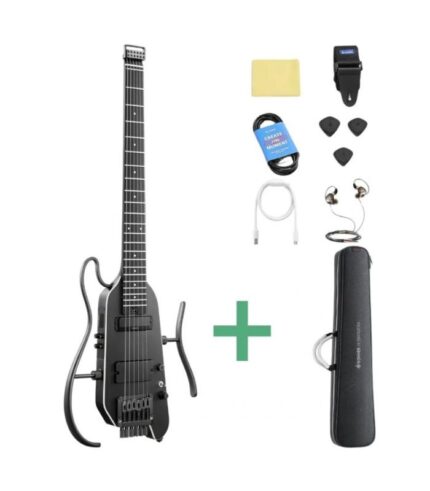 Silent guitar with matte black finish, built-in multi-effects and amp modeling. Ideal for silent practice, home recording, and travel – play with headphones or record directly via USB-C.