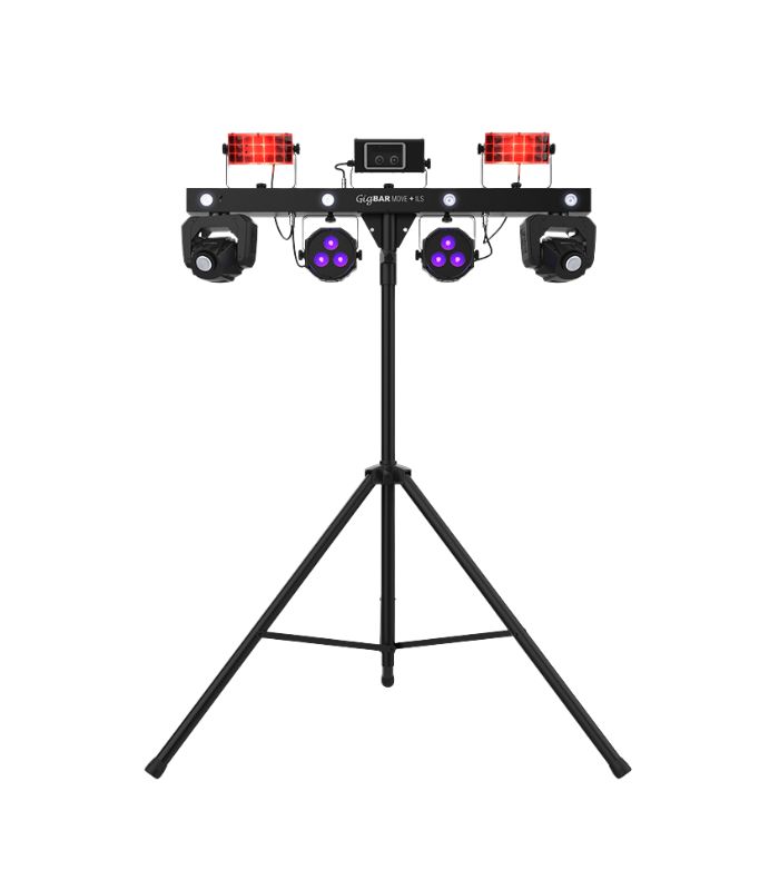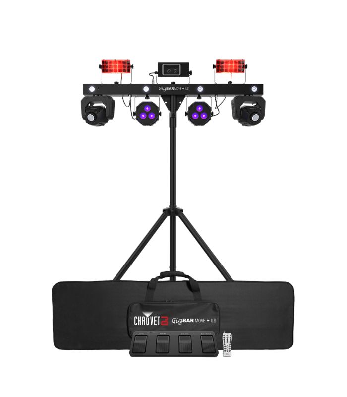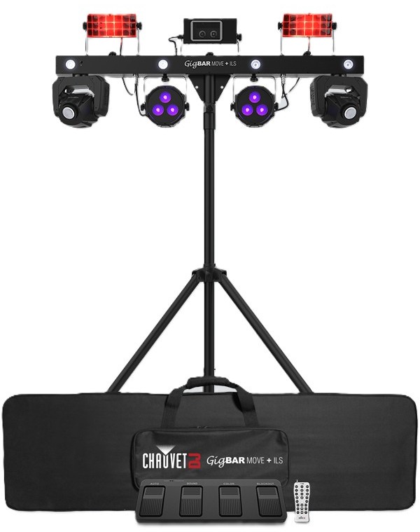 • The future of easy lighting synchronization is here with GigBAR Move + ILS. GigBAR Move + ILS can control any ILS-enabled fixture, wired or wirelessly. GigBAR Move + ILS is a 5-in-1 lighting system that includes moving heads, derbies, washes, a laser and strobe effect pre-mounted on a single bar. Easy navigation and access to all the powerful 32-watt moving head functions can be accessed directly from the full-color LCD display and Totem Mode keeps the moving heads focused on the dance floor. Built-in UV LEDs illuminate florescent objects for dazzling blacklight effects. GigBAR Move + ILS gives you individual control of each effect to ensure your show looks the way you need it to, but gone is the need to aim a remote directly at the unit! The included RF remote triggers built-in shows without needing line of sight operation. Other easy control options include stand-alone mode, DMX, or wireless footswitch. The GigBAR Move + ILS package includes a tripod, wireless footswitch, RF remote and FREE carry bags to ensure quick setup.