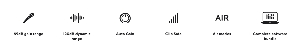 • Air mode, with Presence and Harmonic Drive, gives you that big console sound wherever you record. Auto Gain and Clip Safe make sure you'll never need to worry about your levels. And the Hitmaker Expansion software bundle includes all the tools you need to record, produce and release your tracks.