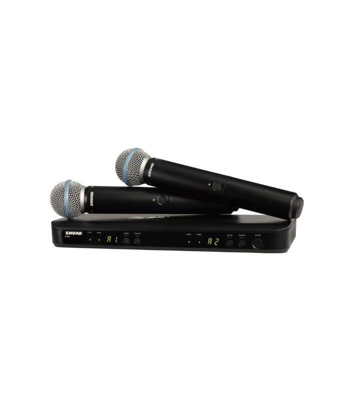 • The Shure BLX288/B58 Wireless Dual Vocal System combines professional-quality sound with simple setup and and up to 14 hours battery life for legendary audio performance for two vocalists right out of the box. The system includes BLX88 tabletop dual-channel receiver, 2 legendary BETA58A handheld transmitters, 2 microphone clips, power supply, 2 AA batteries, and user guide.