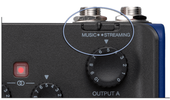 • Toggle from recording to livestreaming with the Music/ Streaming Switch. When in Music mode, each input acts independently with individual gain control. It also sends separate mixes to each headphone output. When in Streaming mode all inputs are combined into one signal to work seamlessly with your streaming software.