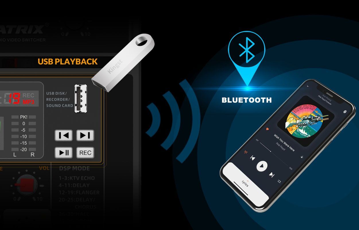 • This audio mixer integrates Bluetooth connectivity and USB drive playback, offering users a seamless and convenient audio exprience. It also features a compact screen for easy operation, enhancing user control and accessibility.