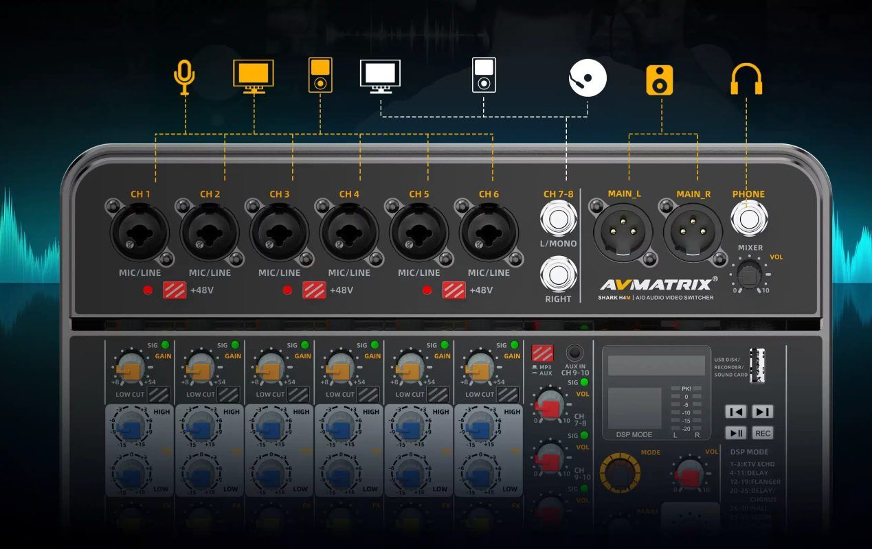 •  6× microphone & 2× stereo inputs, 4-CH input embeded audio