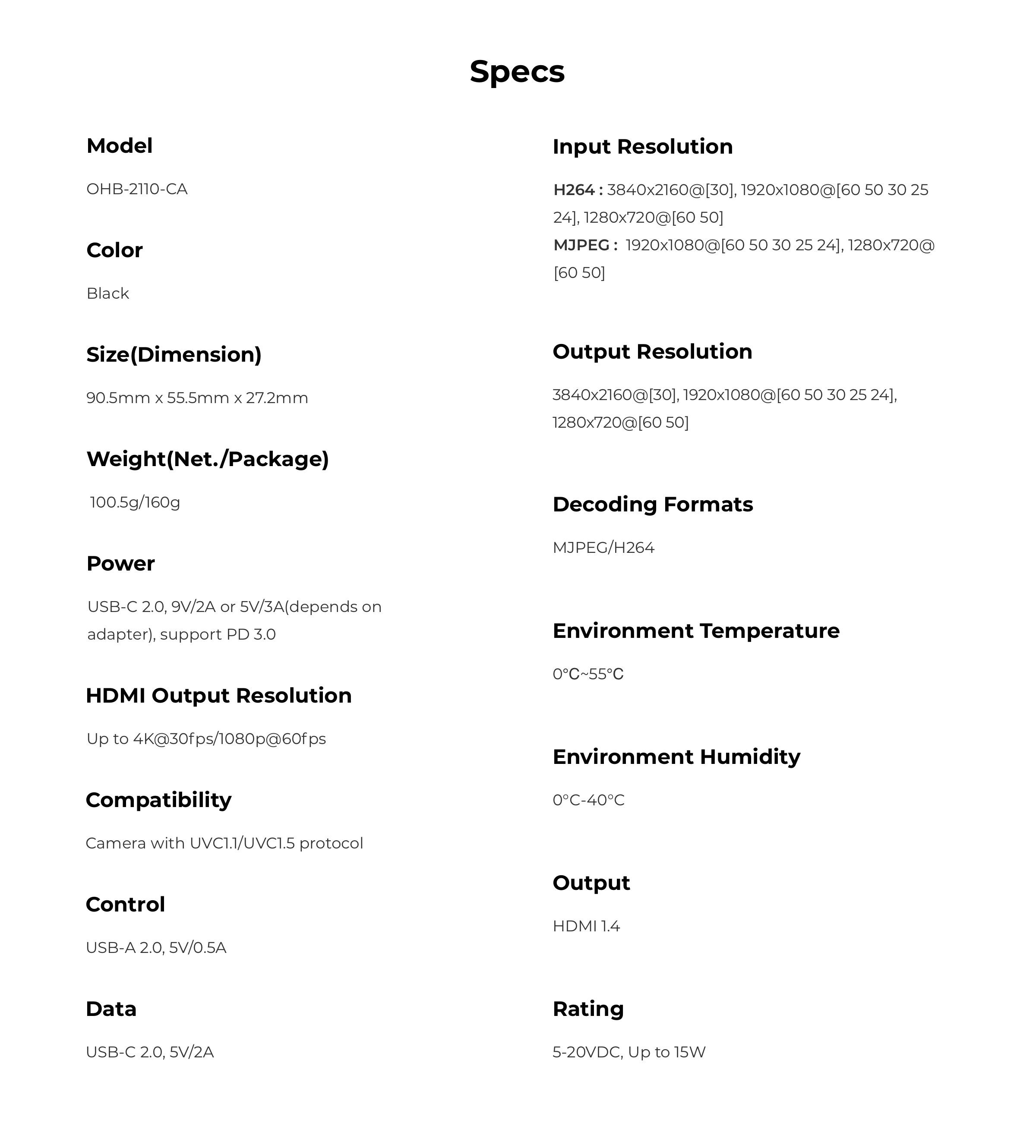 • Support the conversion between the UVC and the HDMI, with up to 4K@30fps & 1080p@60fps resolution and decoding solution, the OBSBOT UVC to HDMI adapter allows you to unfold more possibilities of the OBSBOT webcam devices.